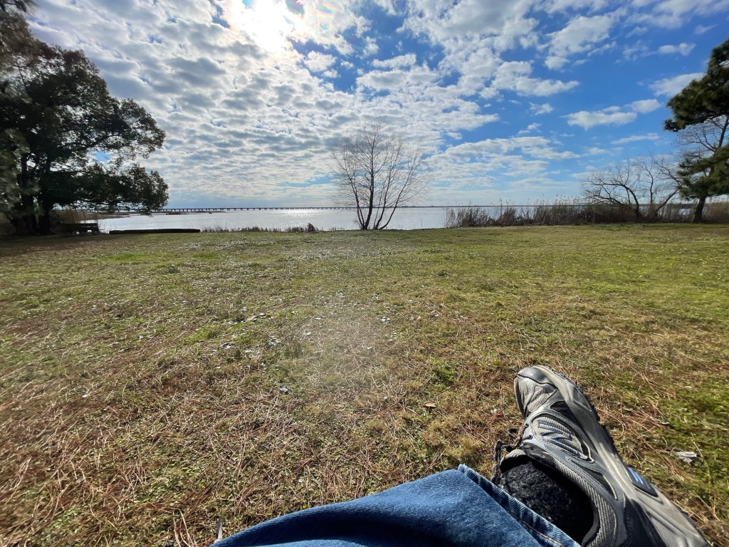 We arrived yesterday and set up camp. MUCH warmer than it’s been for us so far, the snow is almost gone. A beautiful (I think I use that adjective too much, but it fits) location on the water. We watched the sunset and cooked dinner over our fire. I had fun walking in the marsh in the dark and shining a light on the giant (20-30 lb) South American rats (look up “nutria”) and gators, then came back to Susy and had an enjoyable evening sitting and talking by the fire.