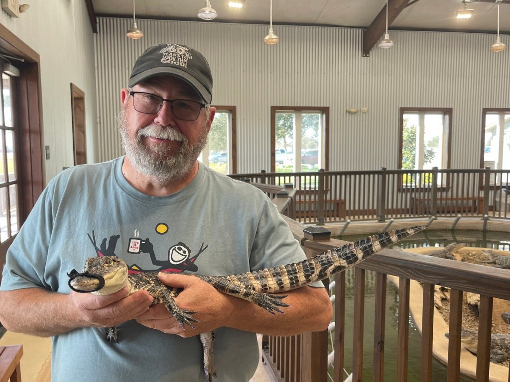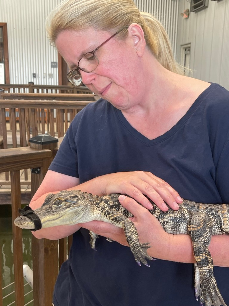 Today we went to Gator Chateau in Jennings, Louisiana. Worth a stop if you happen to be passing by that way, but not so much if it takes you more than 15 minutes out of your way. On the face of it, they are an alligator education center, to spread knowledge about the American alligator (alligator mississippiensis if you want to get all technical about it). In the reality, it’s an alligator themed gift shop, and oh by the way, they have some alligators ranging from 1 ft long babies to 3 ft long 1-2 yr olds, to 4-6 foot adolescents.