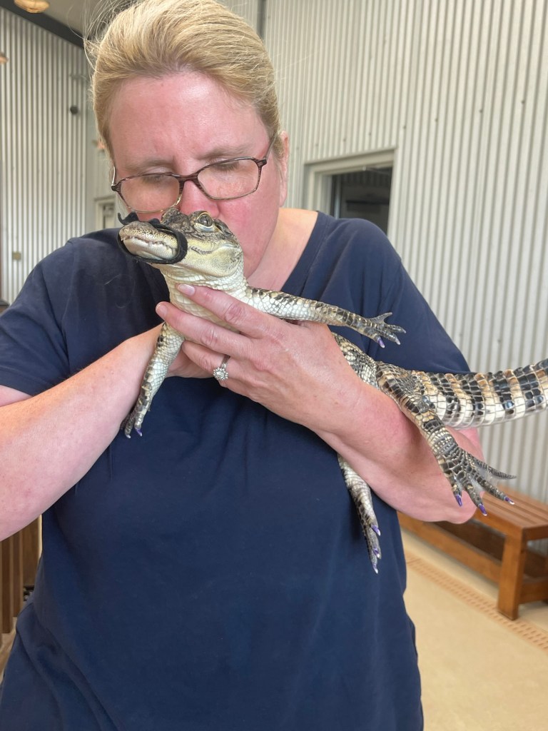Then it was her turn. She looked that lizard straight in its freaky vertical-pupiled eye, cradled it in her arms, and gave it a kiss! That gator showed no fear whatsoever!