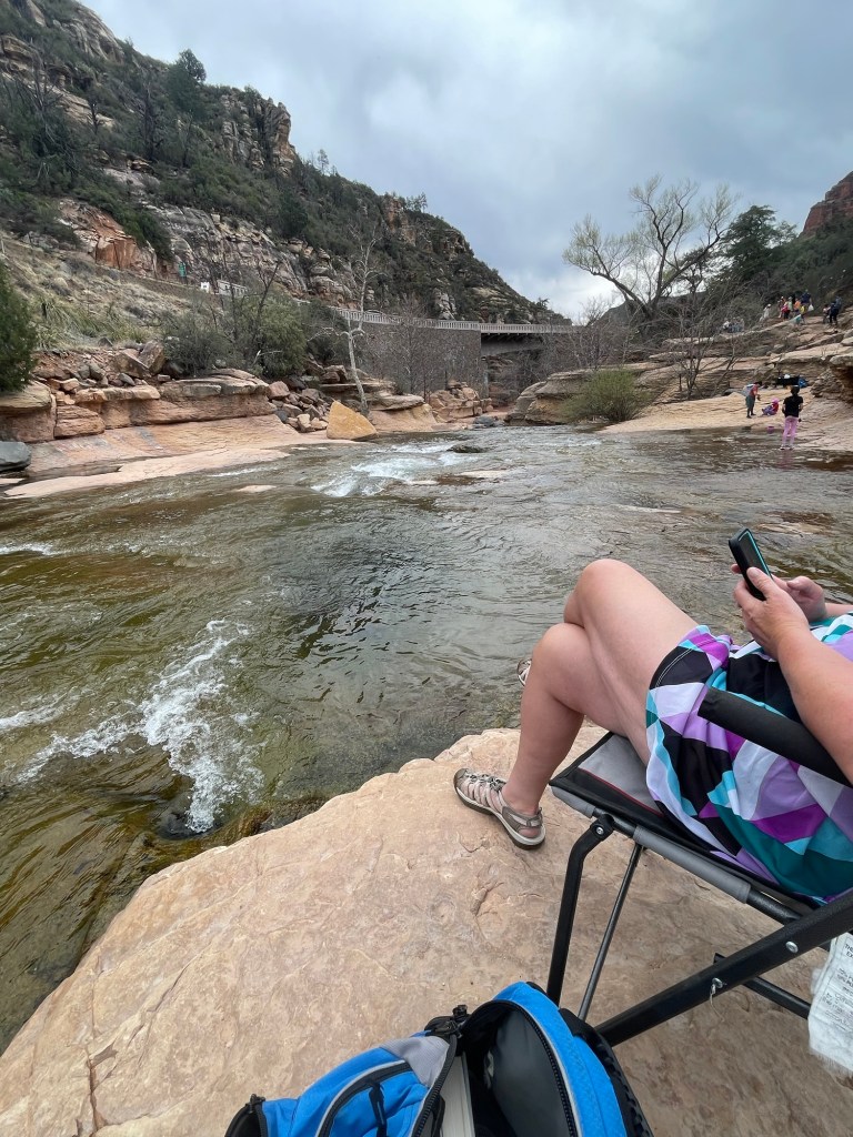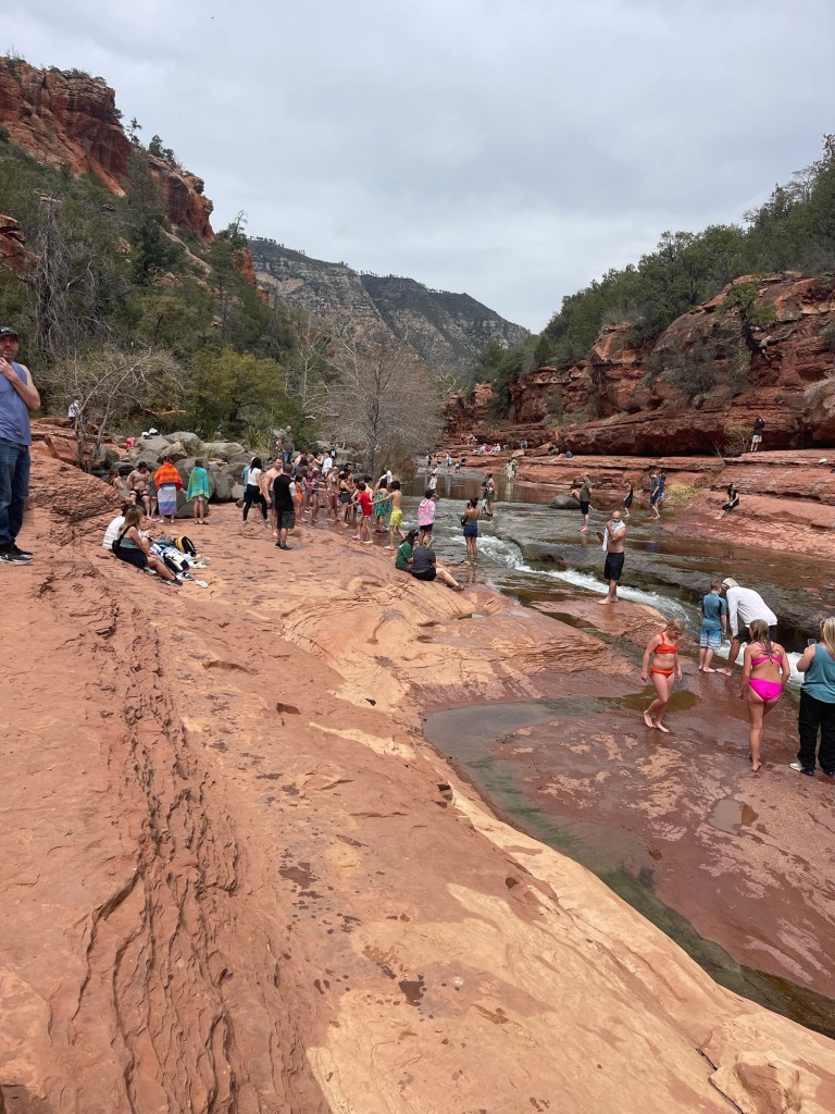 Oak Creek comes down from the hills above and has cut a deep notch in the rock, making a natural water-worn flume, about 3-4 feet wide at the narrowest, and a hundred feet or so long, and then spreading out to beautiful wide pools. The flume is surrounded on both sides by what almost looks like a natural amphitheater. The red rock is cut away in steps and layers, making perfect seating to watch the fun.