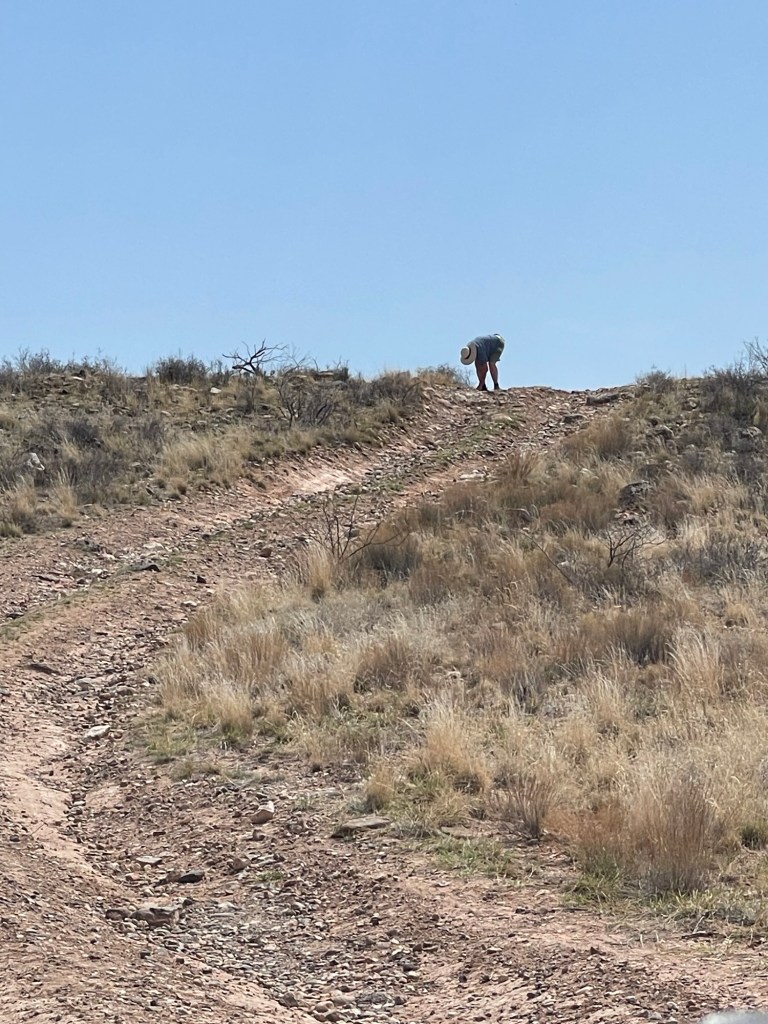 As we searched, a HUGE cow came over the hill, stopped and stared at us, and then started bellowing. Over and over she bellowed, and trotted closer and closer, just raising a ruckus. Straight towards us. We got nervous so we went back to the truck, and she finally veered aside, still hollering like mad, and kept going. Crazy!