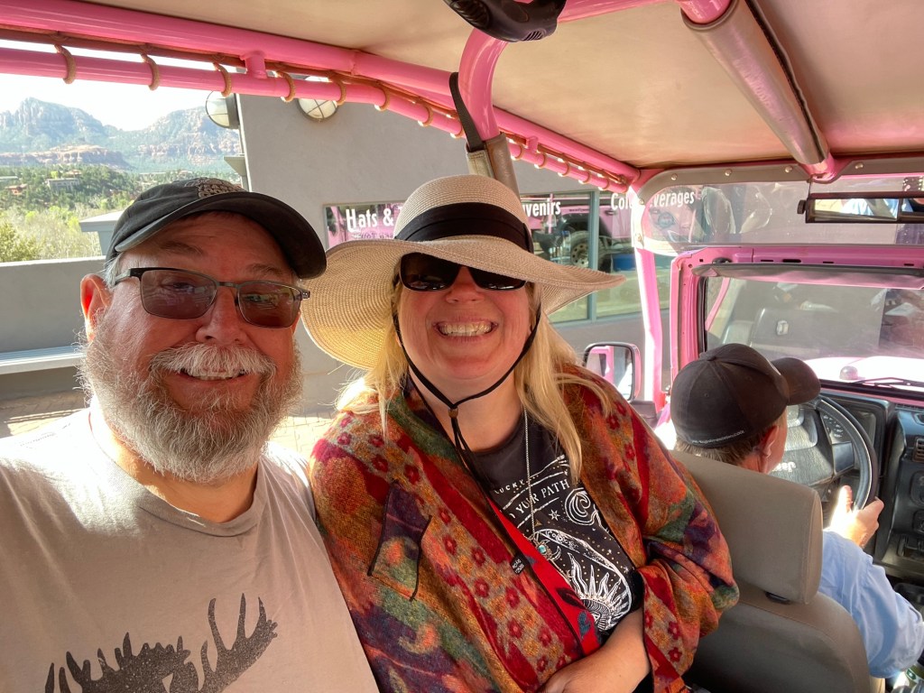 Today, we went on an off-road tour in Sedona in a PeptoBismol-pink jeep. Sitting in the back, letting someone else do the driving for a change, we went up and down some of the roughest dirt tracks I’ve ever done. It was a road, sort of. Rocks, bumps, drop offs, this “road” was a mess. But it was a beautiful area with scenic views into the Coconino National Forest.