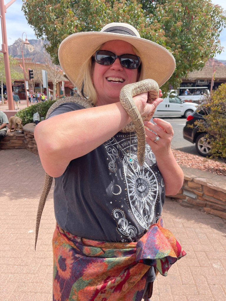 After the bumpy ride, we spent some time walking in Sedona, lunch, a little shopping, and Susy got to hold a snake.