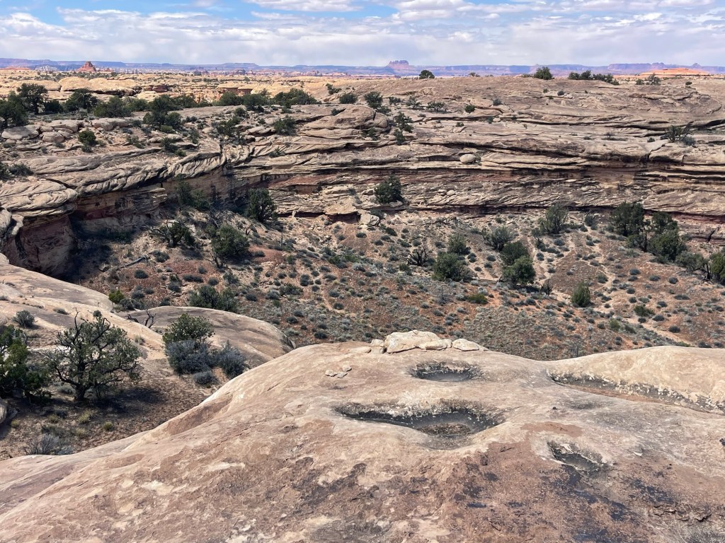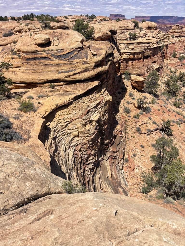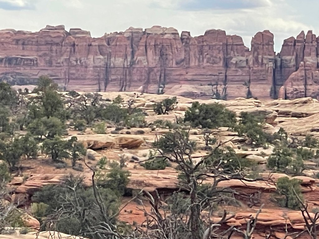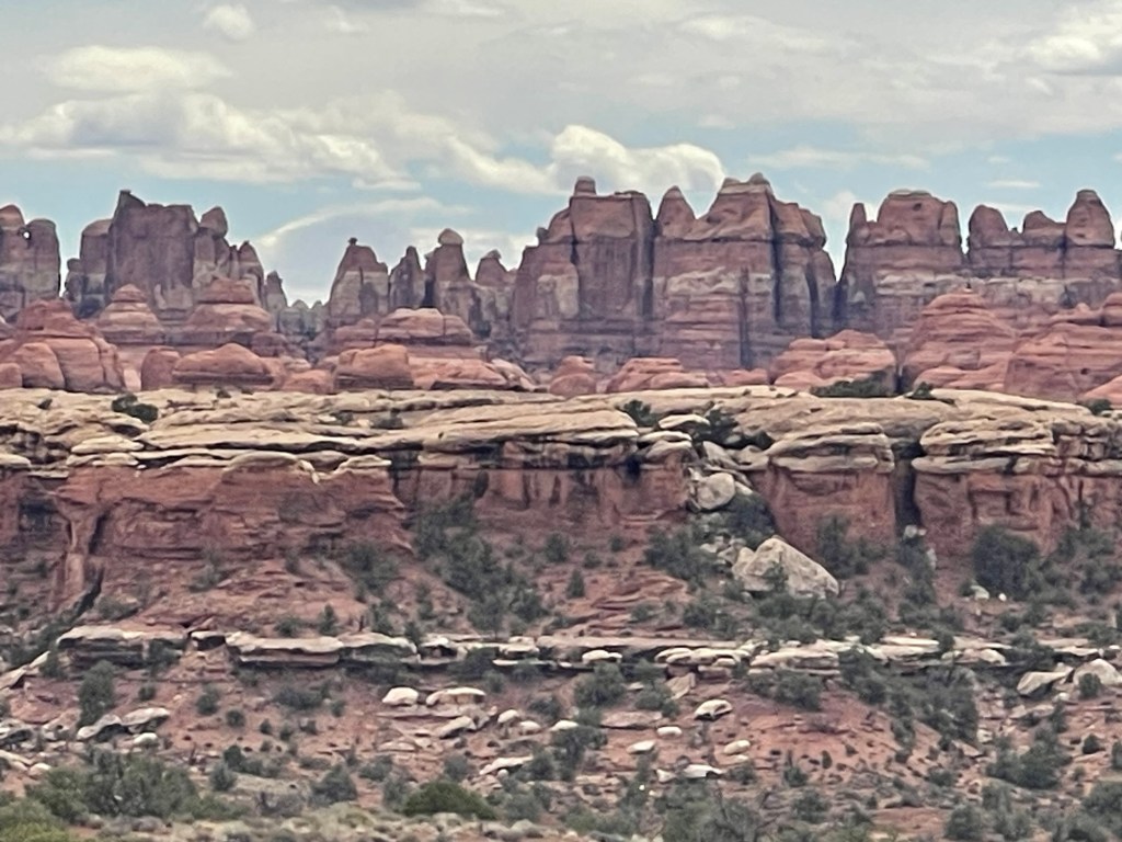 Off in the distance, I could see the rock formations that give this part of the park its name. The Needles were formed by a thick layer of sandstone laid down over 200 million years ago on top of a layer of salt. Over millennia, as the salt dissolved, it caused regularly spaced cross-hatched cracks in the sandstone leaving thousands of closely packed spires of rock.