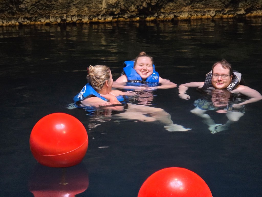 After visiting the falls, we drove out to Heber City to swim in some hot springs. “Hot” is probably not the best description, they were a comfortable 93 degrees, like a nice warm bath. Called Homestead Crater, the resort is developed around a geothermal hot spring inside a cavern. It’s a big symmetrical mound, where once upon a time, water bubbled up out of the top of the mound. Years ago, the spring was tapped, so water receded inside the mound into a large circular cavern. The crater is about a hundred feet deep overall, with 65 feet of water inside, they drilled a tunnel into the side and now it’s a swimmin’ hole, with a short tunnel hole in the roof. Annoying, they require life jackets for everyone at all times, and get upset if you don’t wear it properly. No sitting on a vest for you! Put it on!