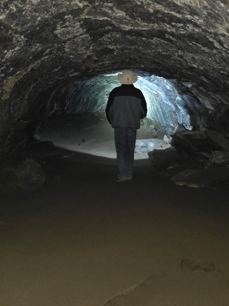 Lava tubes form when a river of lava solidifies around the outside skin, while the molten rock continues flowing on the inside. As the rock flows out, it leaves a long hollow tube cave. We walked a mile in and a mile out, through this long, long, tube.