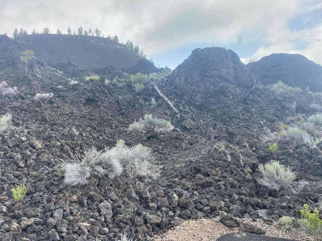 Within that enormous volcano, multiple vents opened up at different times, some as much as 150,000 years ago and some as recent as 1,300 years. Cinder cones are all over the place, rising up from a mostly flat landscape, mini volcanoes in their own right, but all coming from the single giant subterranean magma pipe that feeds them all and IS Newberry Volcano.