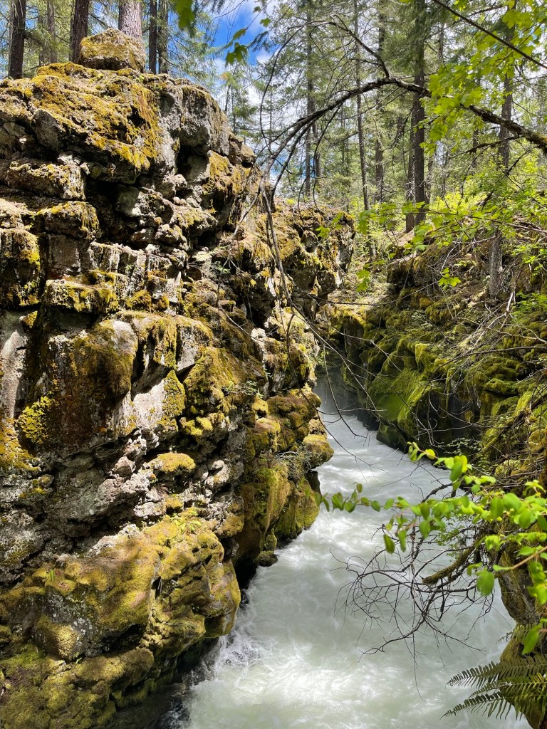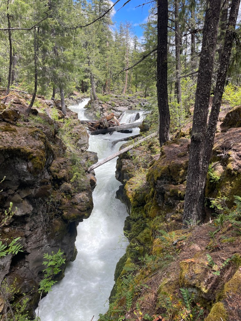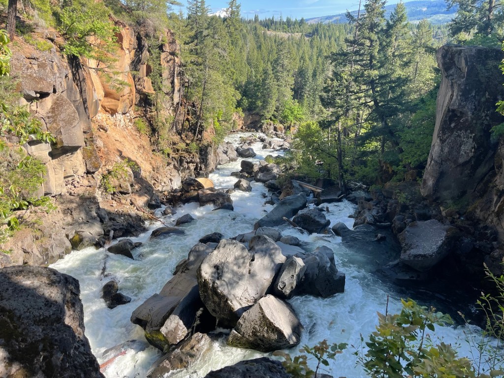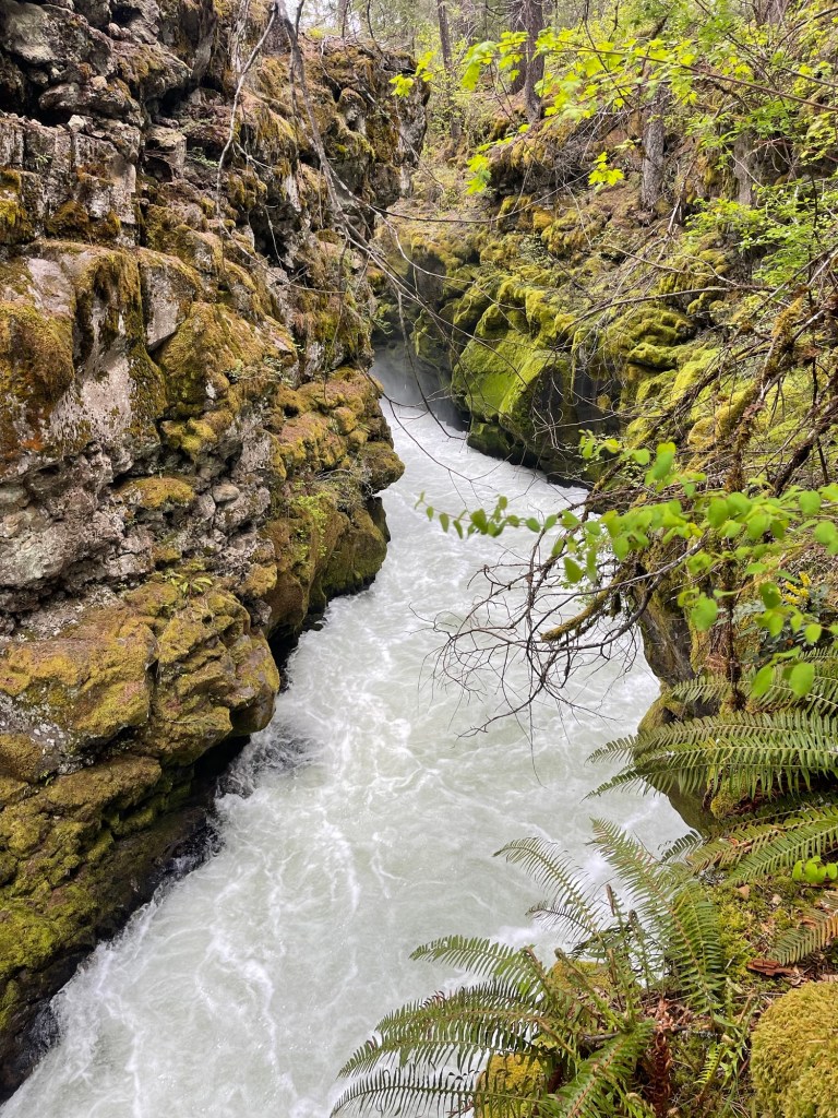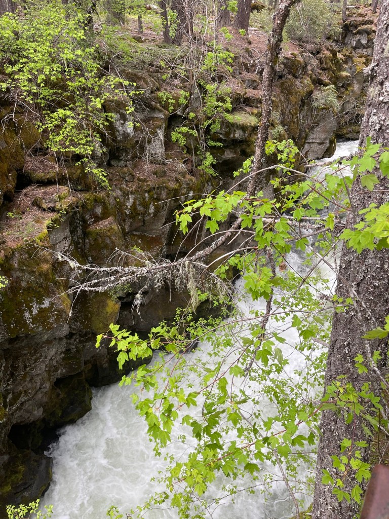 So much of this area was created as remnants of volcanic activity, hundreds or thousands of years ago. Lava flows, lava tubes, damming up the rivers and creeks, making lakes and waterfalls. Just up the highway, we visited the Rogue Gorge Overlook. The Rogue River drops into a narrow deep cut in the land, as little as 20 feet wide in places but 50-60 feet deep. Water boiling and foaming and crashing down at the bottom, I’m pretty sure I don’t want to swim it. And since it all comes from recently melted snow, I KNOW I don’t want to swim in it.