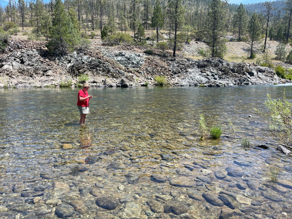 Susanne is in her element, hopping around the banks and then into the river, picking up and discarding pieces, and filling her pants pockets till they can’t hold another pebble.