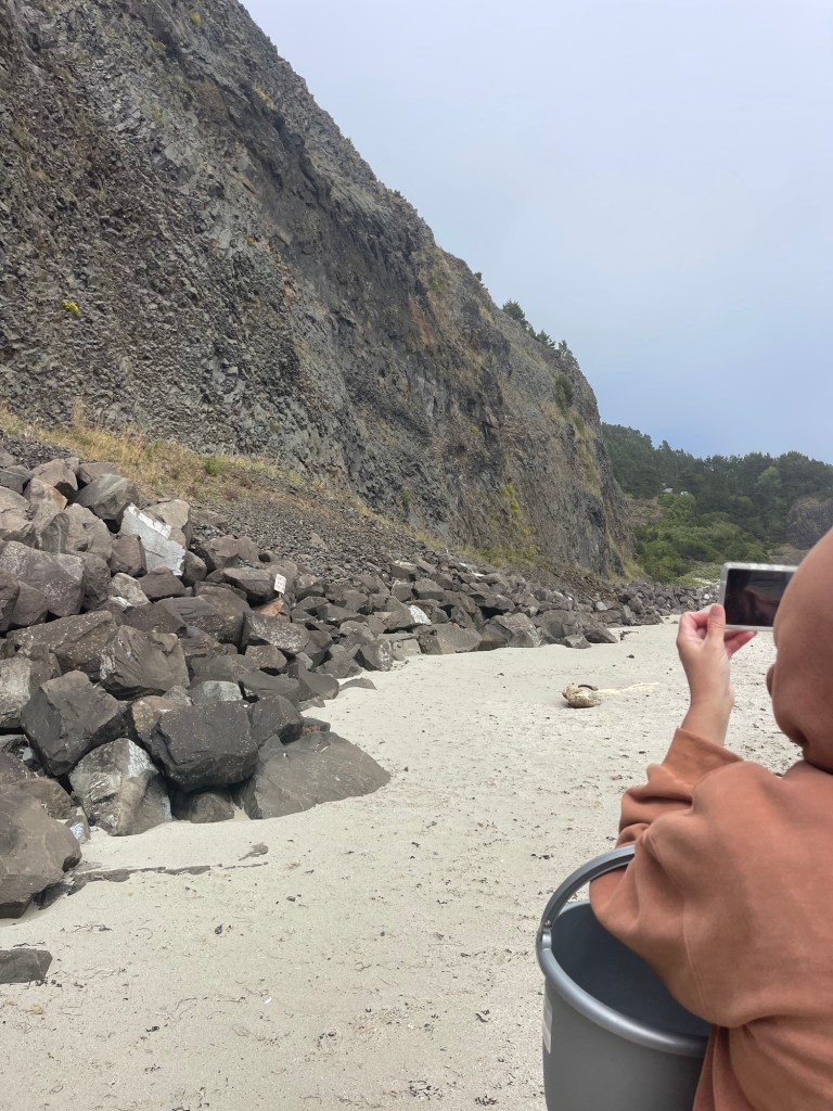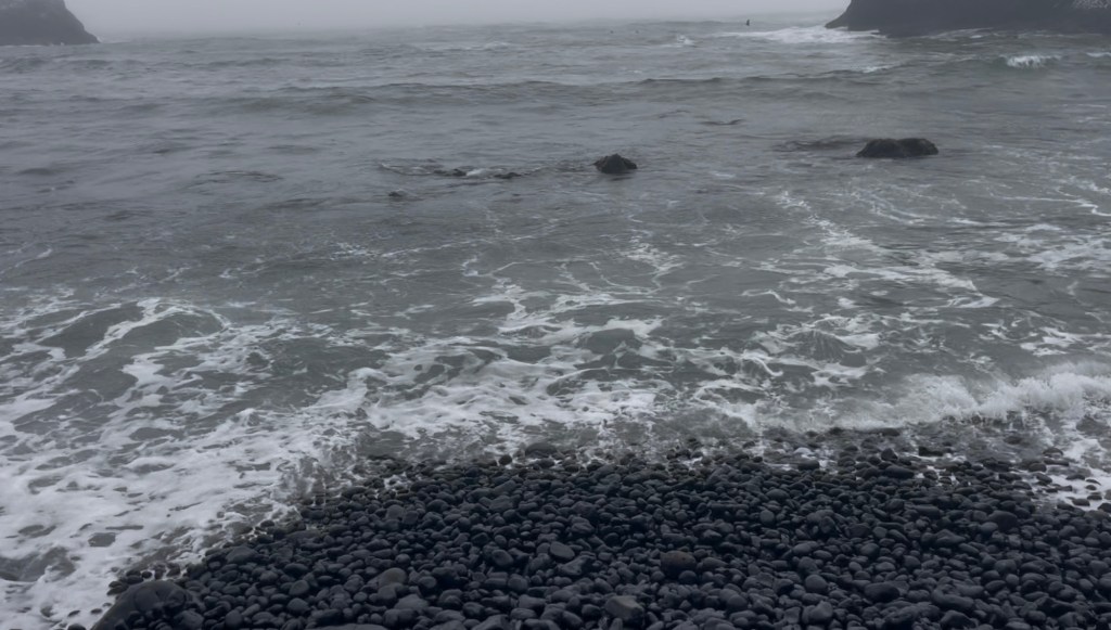 There’s a spot just below the lighthouse called Cobble Beach. The rocks from the cliffs break off and fall to the beach, about baseball to softball sized, then get washed back and forth over and over by the waves, until they are perfectly round little spheres. And we heard the music again!!
