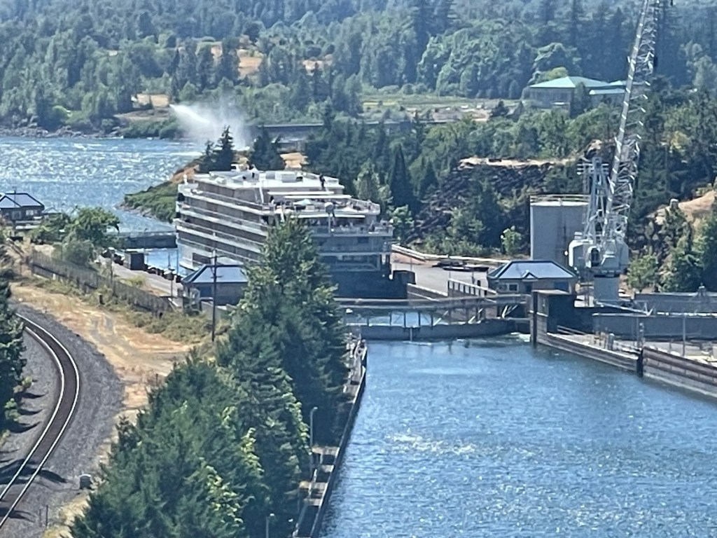 As we rode, we perched on the side of the cliff and were able to watch a river cruise ship go through the locks at a town named, appropriately enough, Cascade Locks OR.