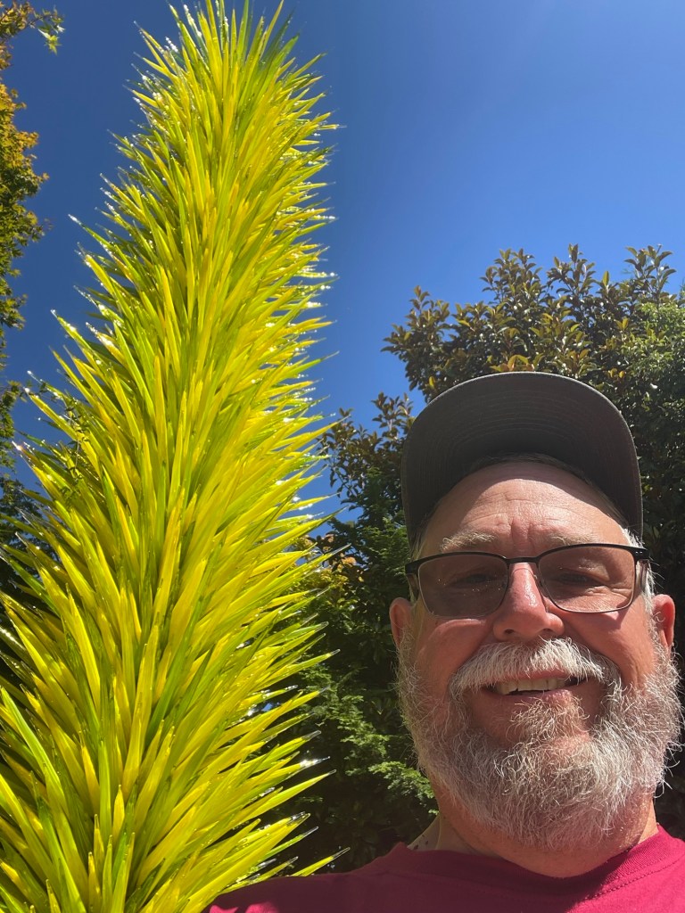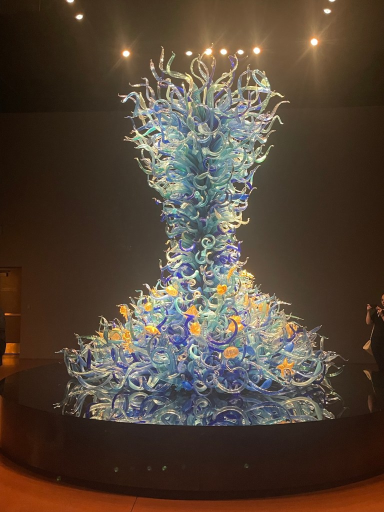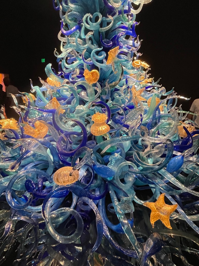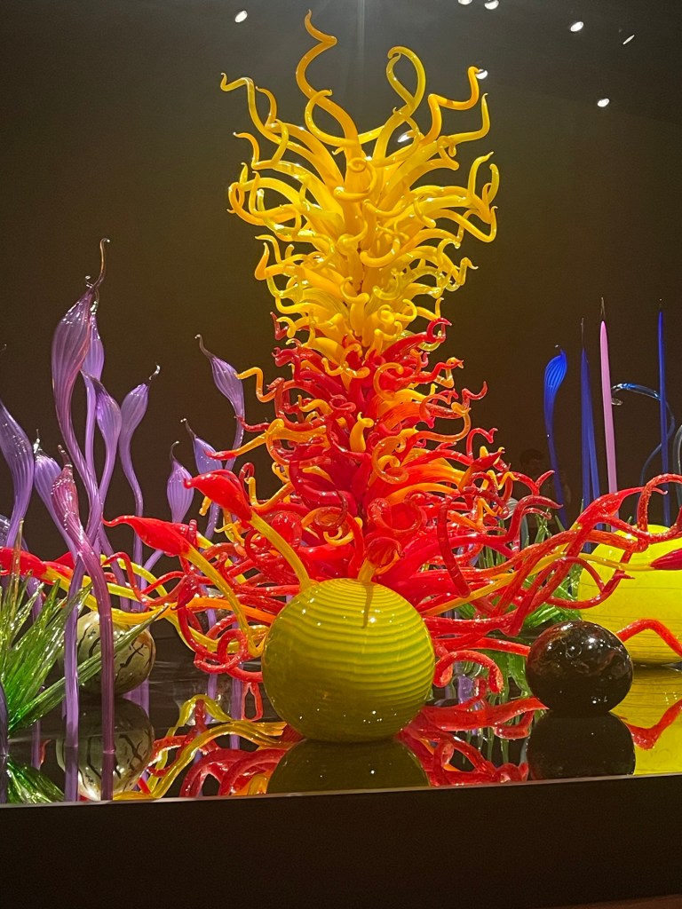 After returning to earth, we moved on to an art exhibit showcasing the works of Dale Chihuly, who I had never heard of, but was apparently one of my mom’s favorite artists. Mostly glass sculptures but some photos and other art pieces, but the glass was definitely what to see. Huge multi-colored glass towers. “Gardens” of glass with grass and flowers, all made of the colored glass. Beautiful work.