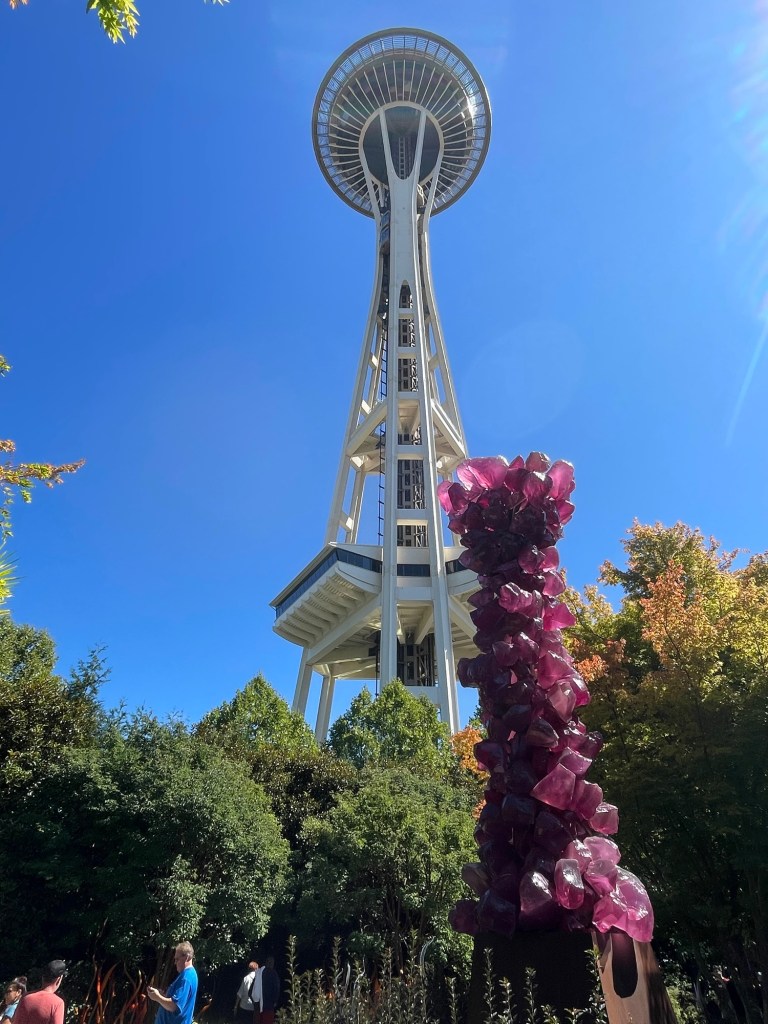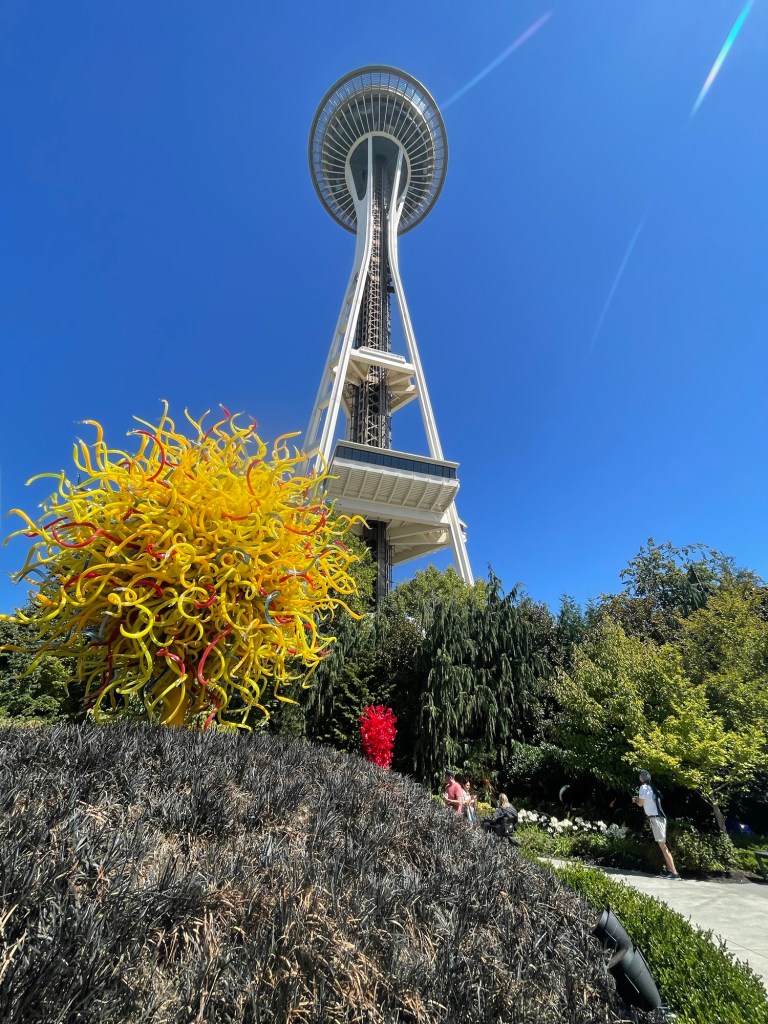 Heading away from the water, up the hill, we found the old monorail and headed again for the Space Needle. The monorail was built for the 1962 World’s Fair. It fell into disrepair for a while, but it was revived and is a nice way to go. Above the streets, it winds around and through, it only has two stops, hop on at one end, and off at the Space Needle. Easy. No stress, all we had to do is ride and sightsee.