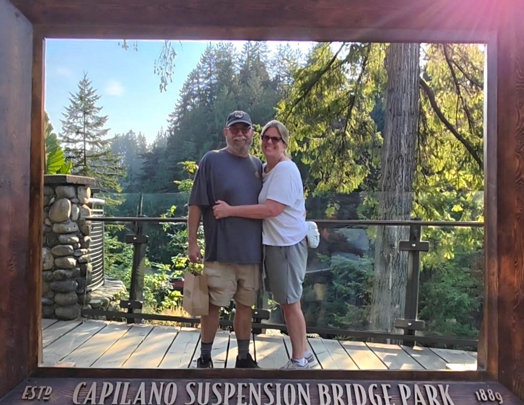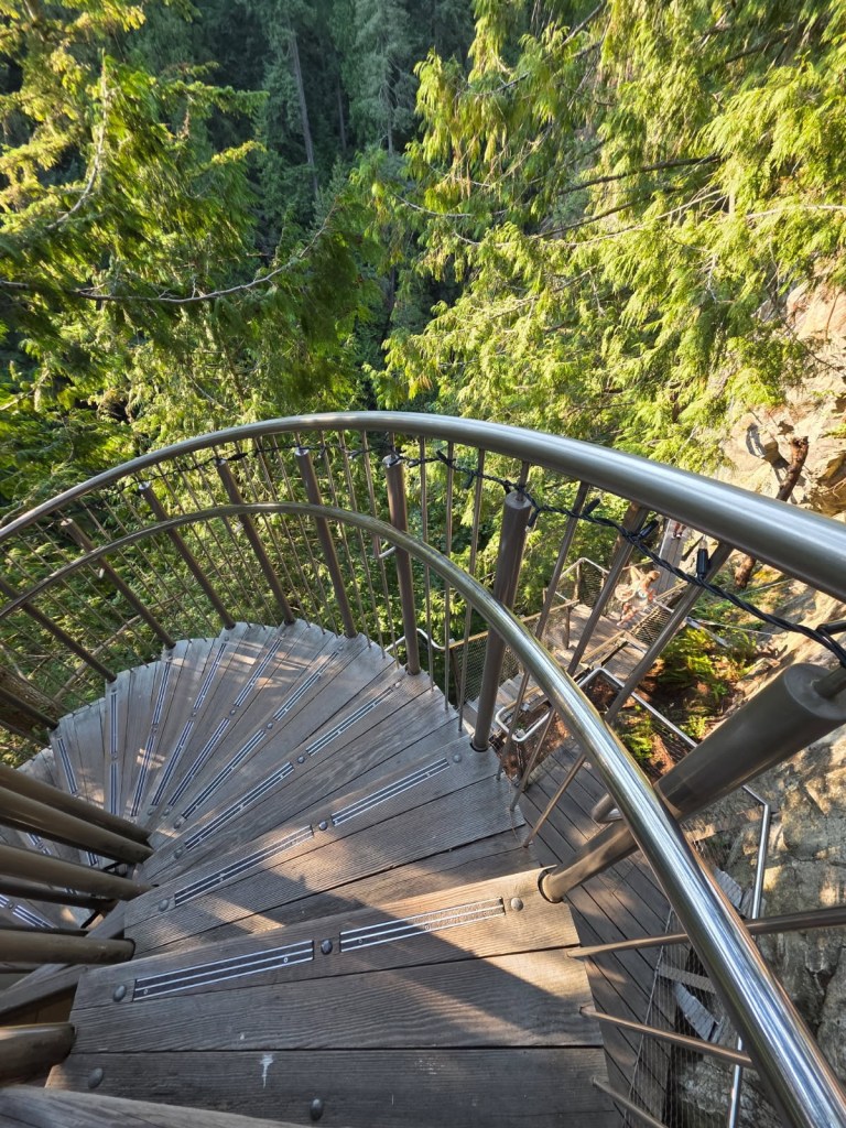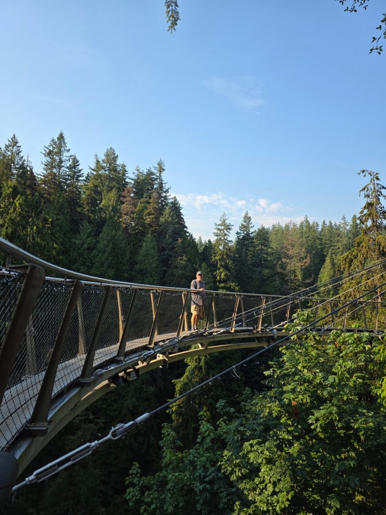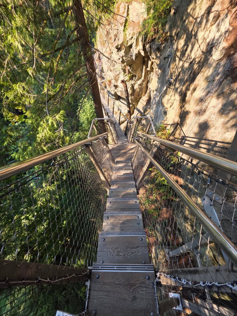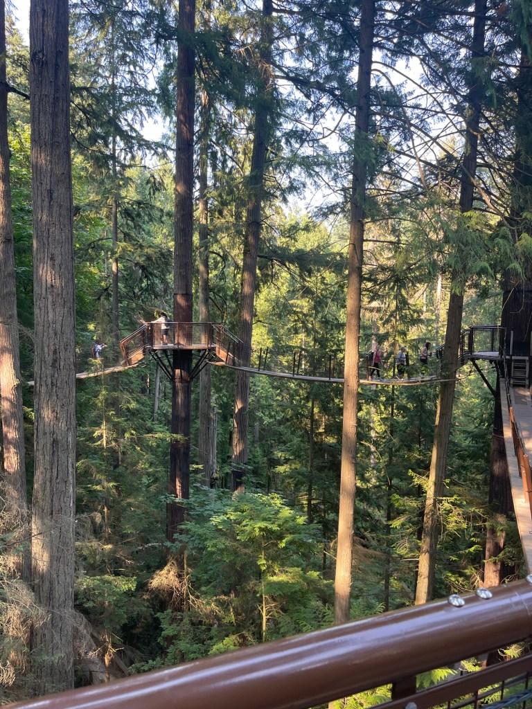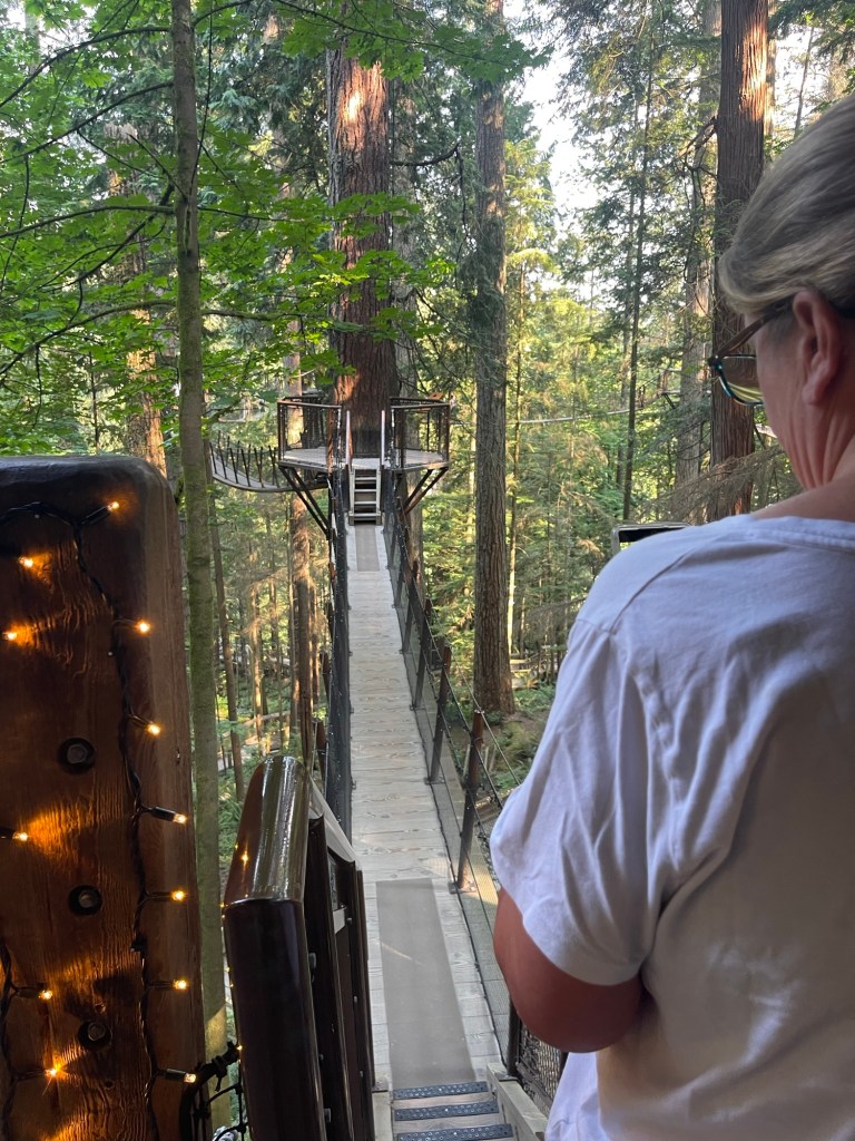 Once back in Vancouver, we went to Capilano Suspension Bridge Park. The bridge was built in 1889 as a tourist attraction, and crosses a gorge at 230 feet above the bottom and 460 feet in length, and just 3 feet wide! Just enough room for people to pass in each direction.