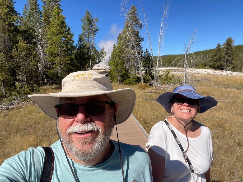 A quick hustle back to the visitor center and we caught another of the movies about the park, explaining some of the science behind all the hot spots. Normally, molten material is in the earth’s mantle, at 1800 miles below the surface. About 640,000 years ago, Yellowstone was a supervolcano over 50 miles wide, exploding and spewing lava across the land, but today the molten rock hovers just underground at only about 4 miles deep. Surface water percolates downward, gets flash boiled to steam, and then pushes its way back up. The constant up and down, water to steam and back, makes YNP what it is. Someday, the magma will win and Yellowstone will again blow its top. Imagine a 50 miles wide volcano in the central US. That’ll put a damper on Wyoming’s tourist industry.