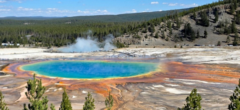 We then moved on to a hiking trail to the overlook for Grand Prismatic Spring. This spring has become even more of a Yellowstone icon than Old Faithful. When I was here back in 2018, the weather was much cooler, so the hot water and steam from the spring created a thick cloud of fog over it and we couldn’t see anything. This time, perfect! And fabulous!