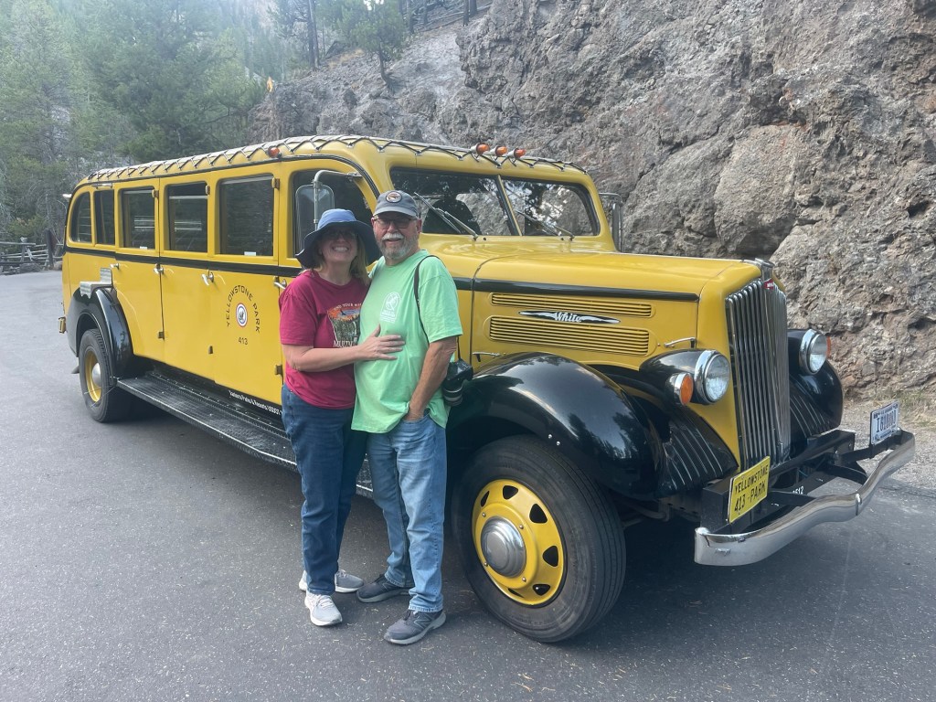 In the evening, we took a tour in one of Yellowstone’s historic buses. They had the same kind of tour buses in Glacier, but those were red. Yellowstone’s are…. yellow.