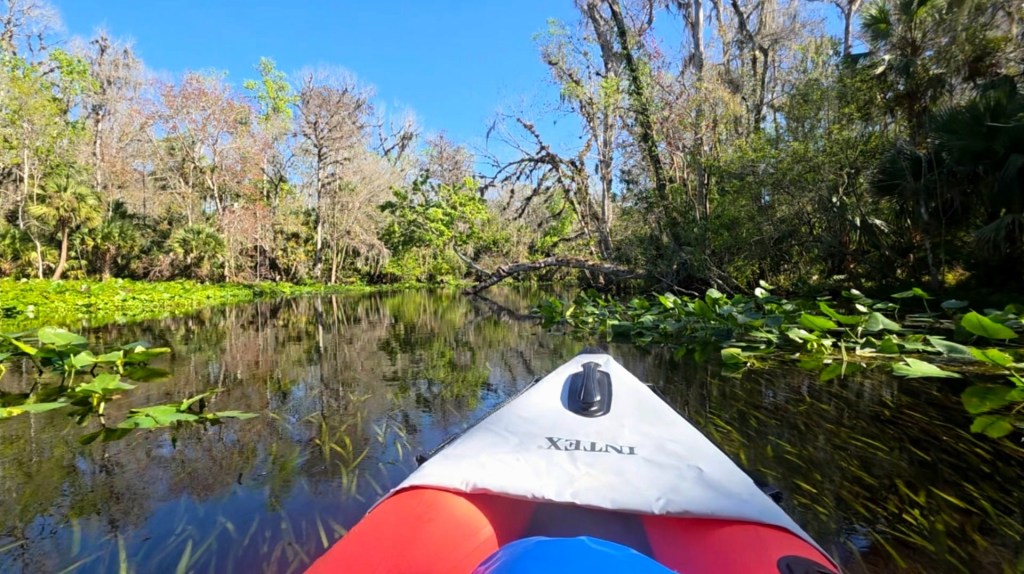 We launched a single kayak this time. Usually we each have one to ourselves, but decided to go tandem this time. Excellent idea! Half as much to inflate, half as much to carry, and I was able to sit back and “steer” while Susy paddled. 😁
